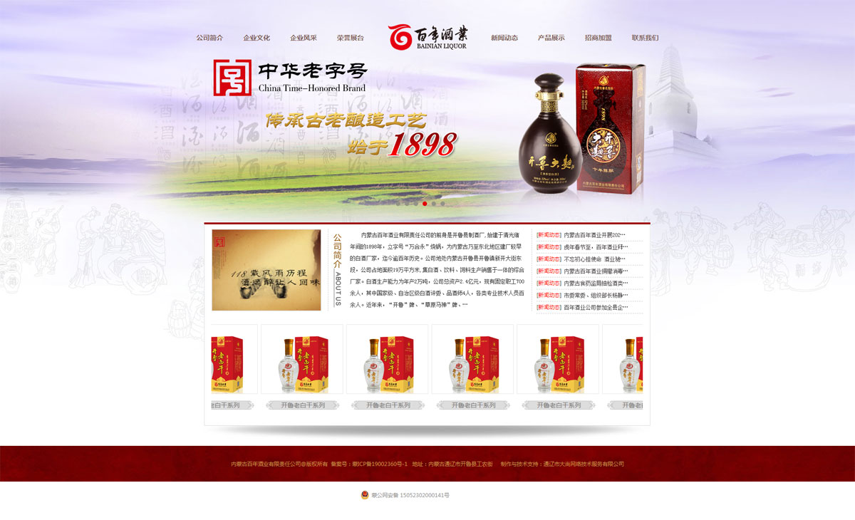 內(nèi)蒙古百年酒業(yè)有限責任公司的前身是開魯制酒廠,始建于1898年的“萬合永”燒鍋,迄今已有120多年釀酒歷史。企業(yè)歷經(jīng)了個體、國營、轉(zhuǎn)制的變革和發(fā)展,現(xiàn)已成為集白酒、木糖、飼料生產(chǎn)銷售于一體的自治區(qū)農(nóng)牧產(chǎn)業(yè)化重點龍頭企業(yè),是通遼域內(nèi)首家榮獲國家商務部頒發(fā)的“中華老字號”企業(yè)。